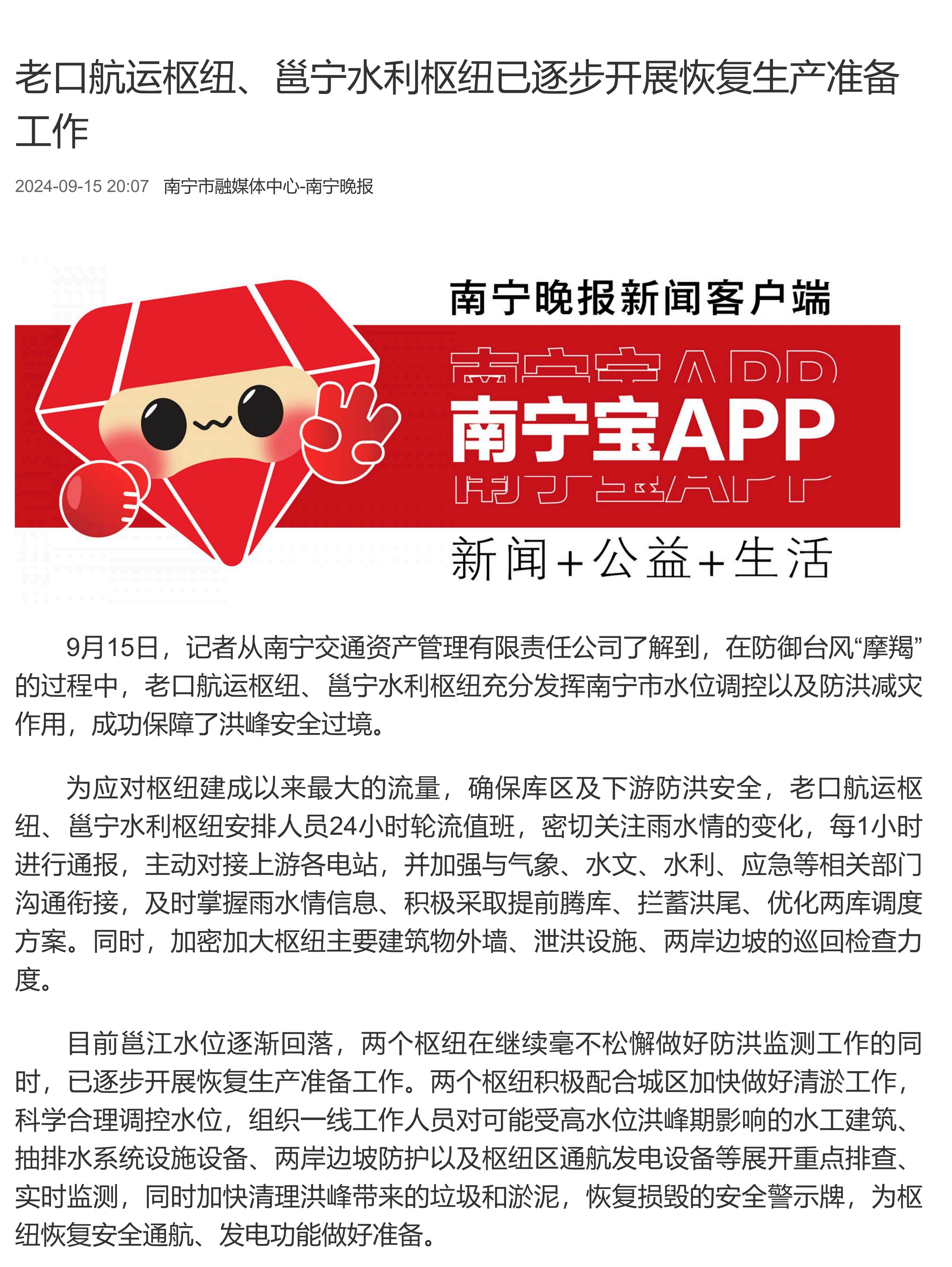 老口航運樞紐、邕寧水利樞紐已逐步開展恢復生產(chǎn)準備工作
