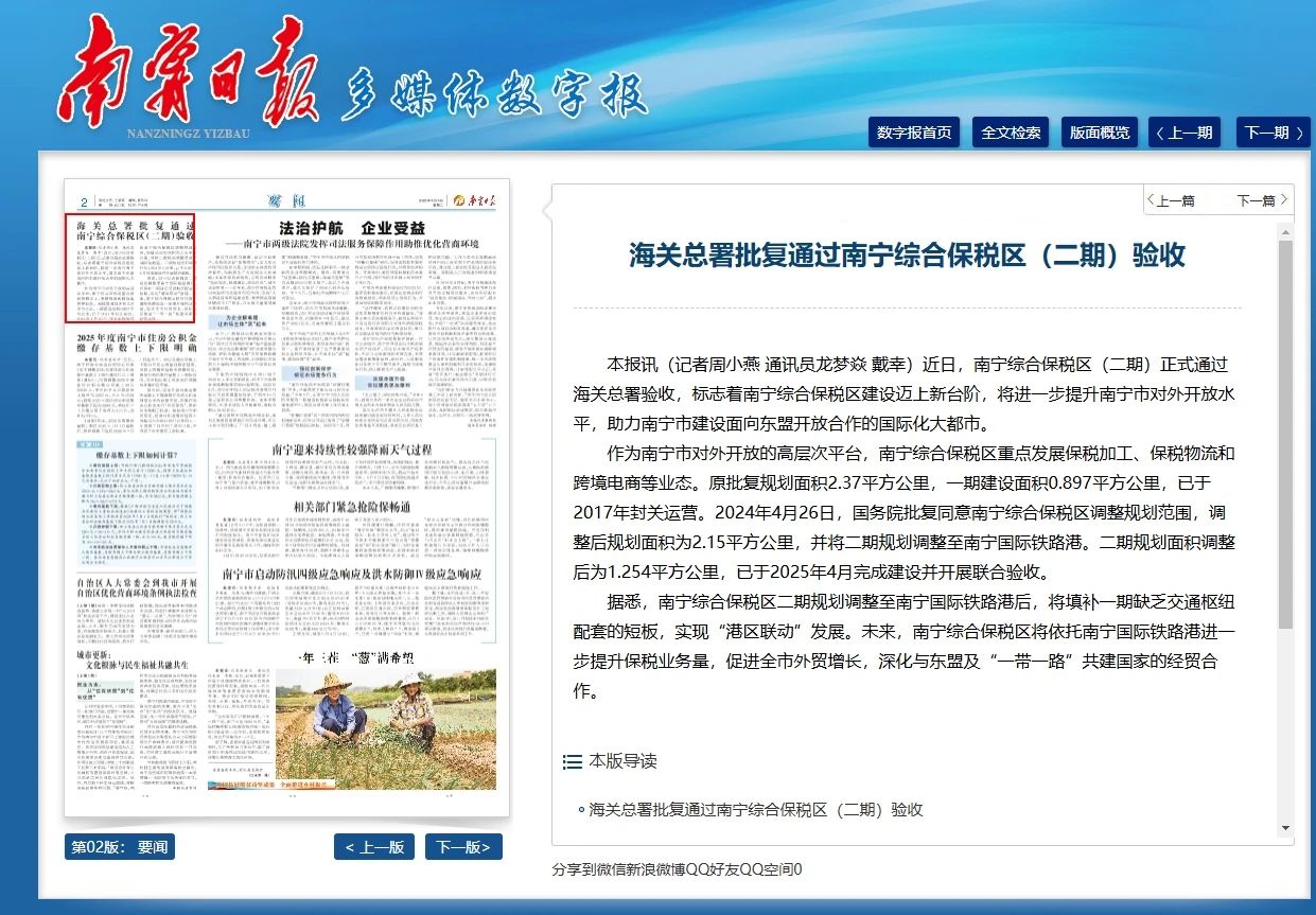 海關總署批復通過南寧綜合保稅區(qū)(二期)驗收